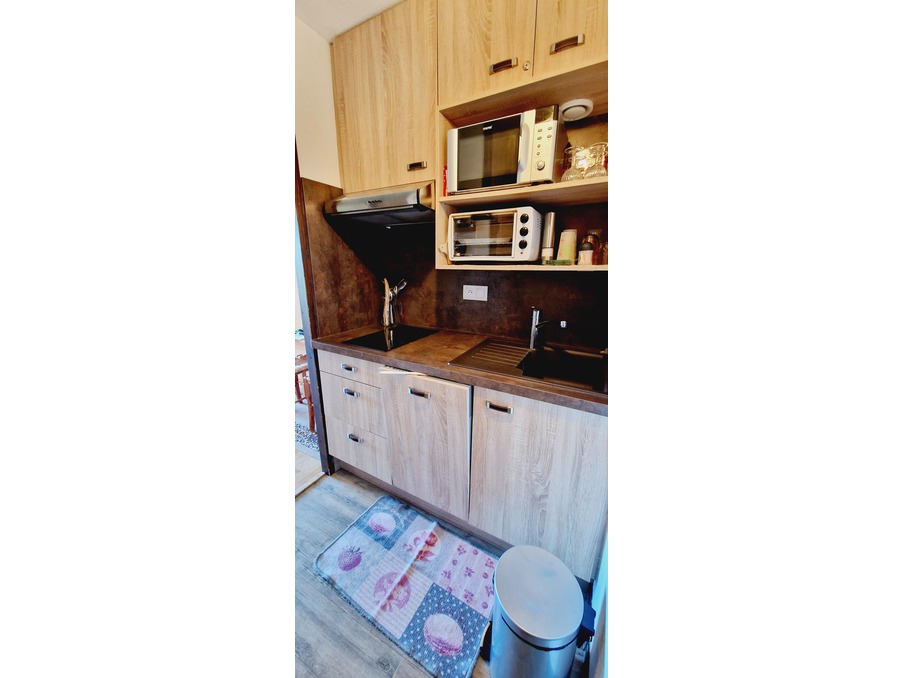 L\'appartement est entièrement équipé avec un réfrigérateur, 2 plaques de cuisson, un micro-ondes, un mini four, un lave-vaisselle, un grille pain, une bouilloire électrique et une cafetière tassimo, pour que vous puissiez profiter pleinement de votre séjour en toute autonomie.