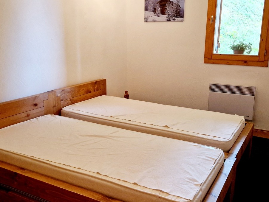 Un coin montagne spacieux avec deux lits 1 place superposés et placard de rangement