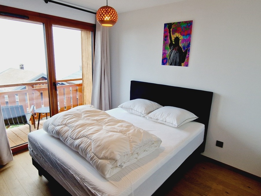 L\'appartement neuf, d\'une surface de 75m2, se trouve au premier étage et bénéficie d\'une exposition ouest offrant une vue imprenable sur les montagnes environnantes. Vous disposerez d\'un garage souterrain (accès avec ascenseur à voiture) pour stationner votre véhicule, ainsi que d\'un ascenseur pour accéder facilement à votre logement. Un casier à ski individuel avec sèche-chaussures est aussi à votre disposition.