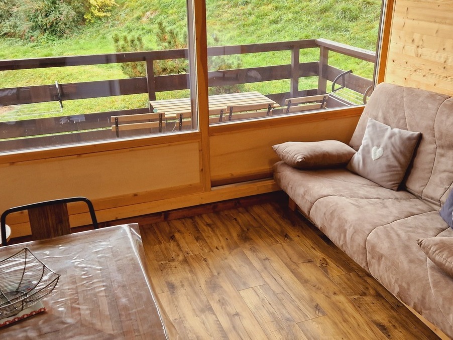 - Pièce de vie lumineuse : canapé convertible (140 cm), télévision, accès à un balcon avec une belle vue dégagée sur la vallée.