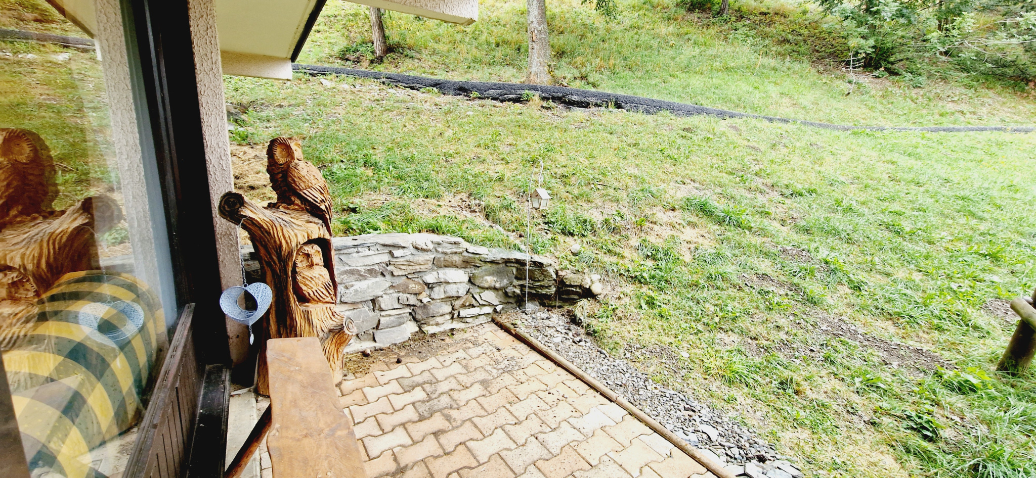Extérieur : terrasse aménagée avec mobilier de jardin et vue dégagée sur les montagnes
