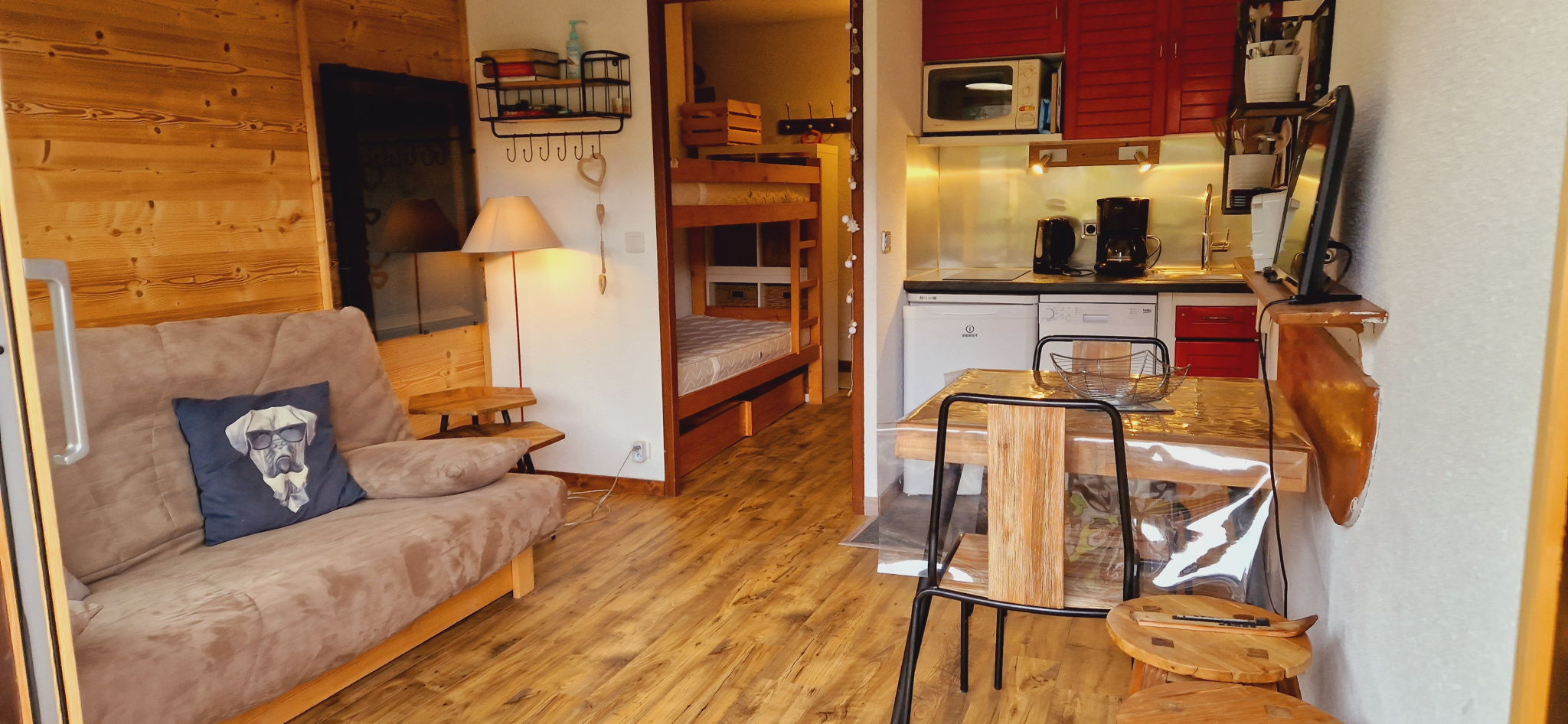 - Pièce de vie lumineuse : canapé convertible (140 cm), télévision, accès à un balcon avec une belle vue dégagée sur la vallée.
