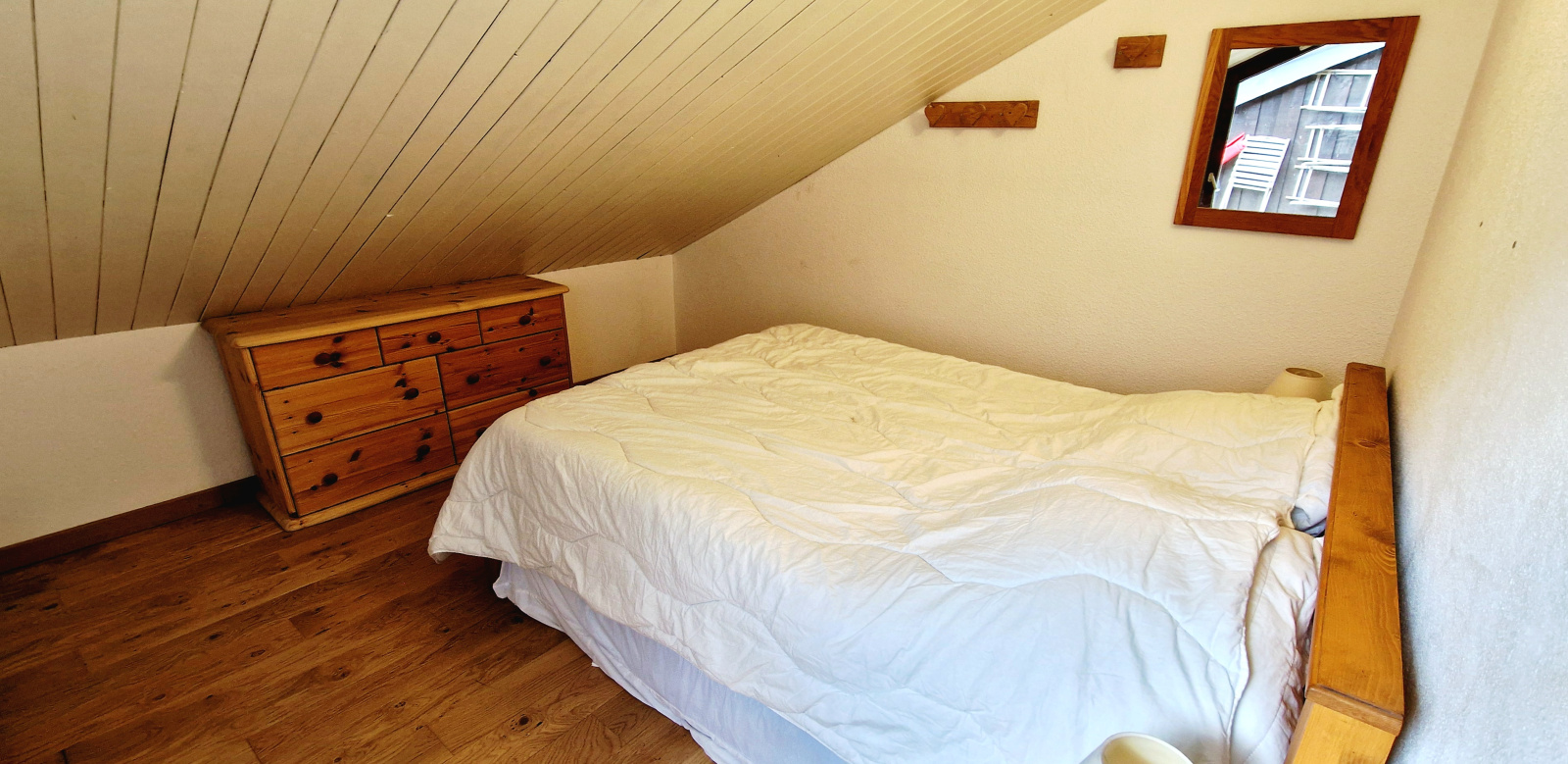 Une chambre (en sous pente) avec un lit double en 140cm, avec espace de rangement .