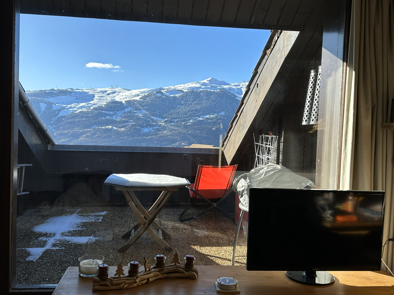 Séjour lumineux avec canapé convertible (140 cm), télévision, et accès à une agréable terrasse sur le toit, offrant une vue dégagée sur la vallée.