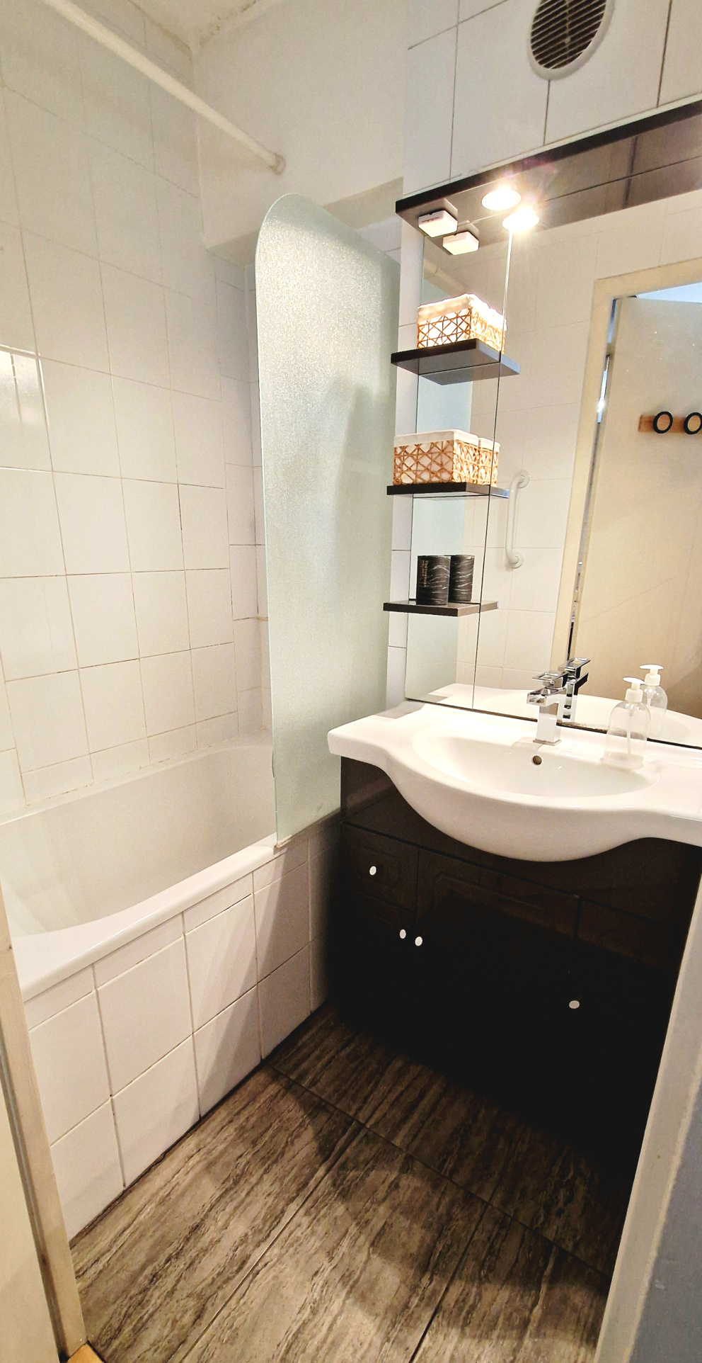 Salle de bain avec baignoire et sèche-cheveux à disposition.