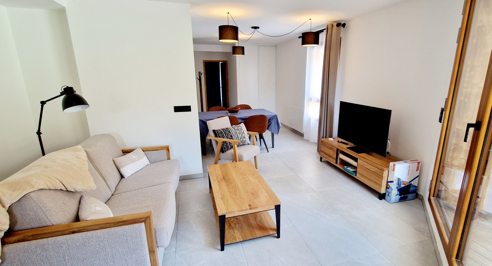 Un séjour avec TV et canapé lit en 140 cm