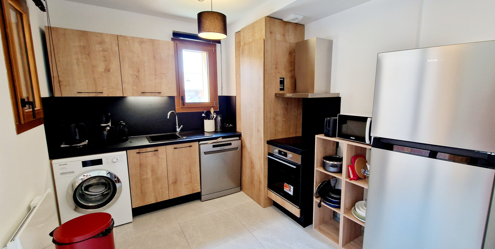 Une cuisine extrêmement bien équipée avec lave-vaisselle, micro-onde, plaques de cuisson, bouilloire électrique, cafetière, grille pain, réfrigérateur, appareil à fondue, appareil à raclette, appareil à gaufre (et croque monsieur), mixeur électrique, batteur électrique.