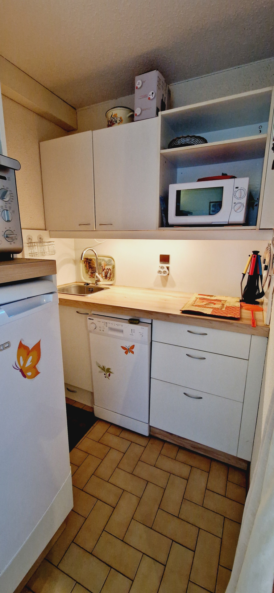 Une cuisine équipée ouverte sur le séjour, avec réfrigérateur, plaques de cuisson, lave-vaisselle, grille-pain, bouilloire électrique, cafetière électrique, four, etc...