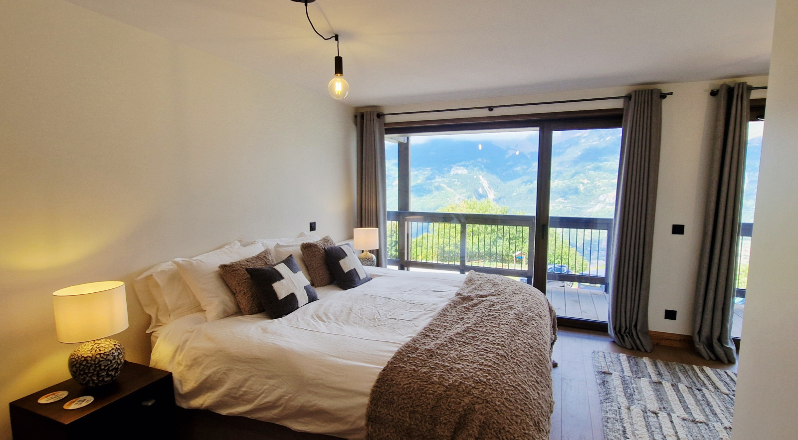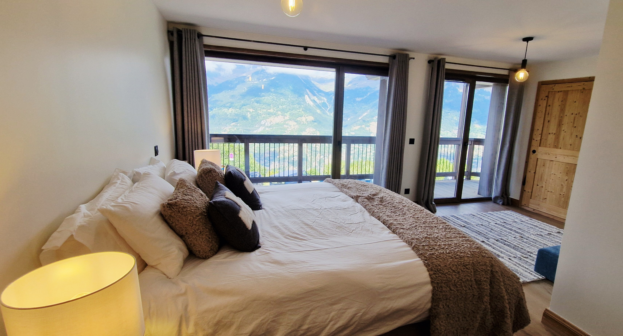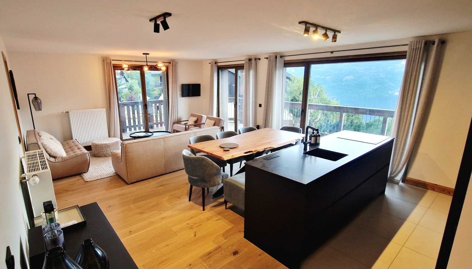 Balcon aménagé offrant une vue dégagée sur la station et les montagnes.