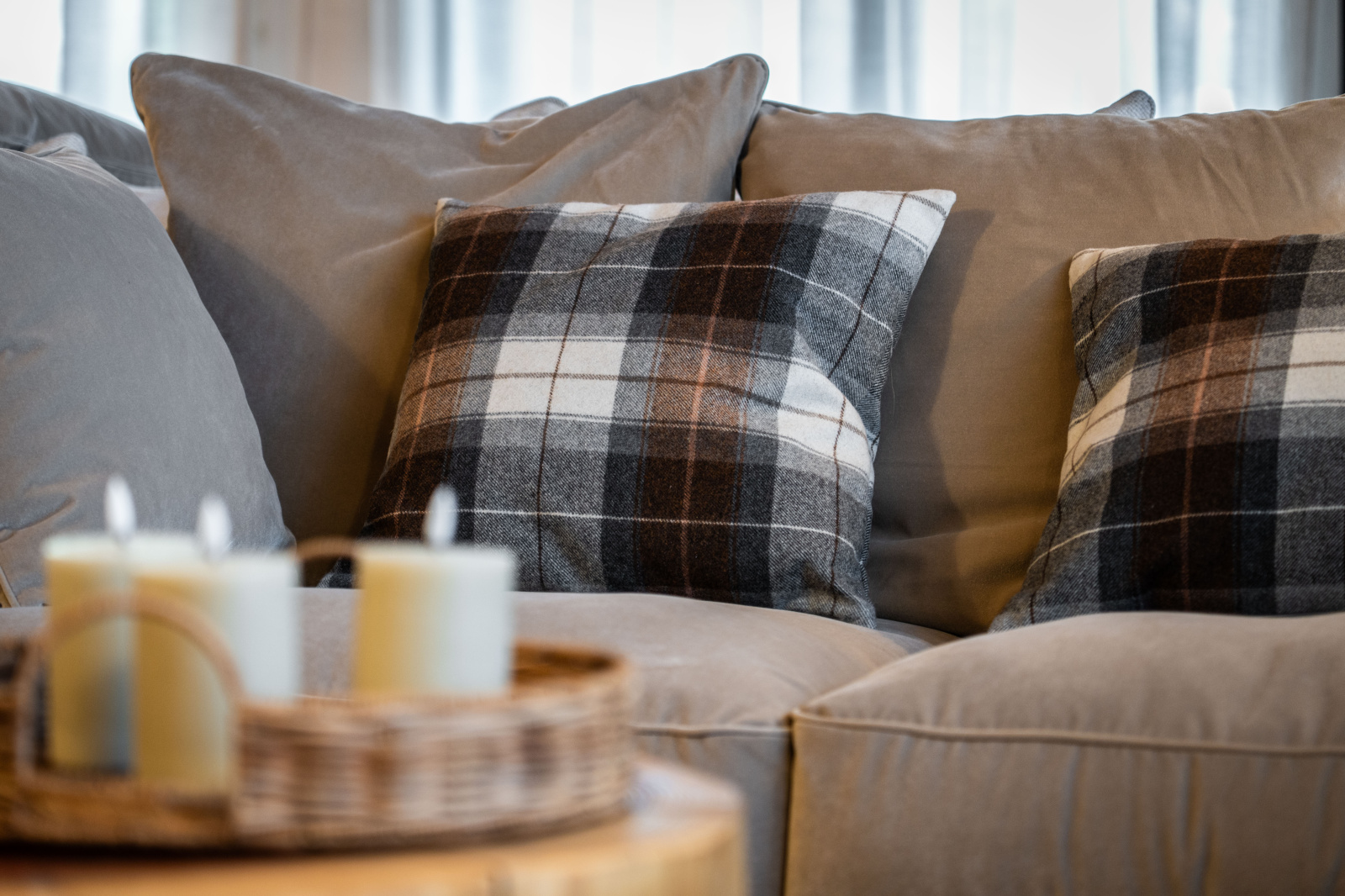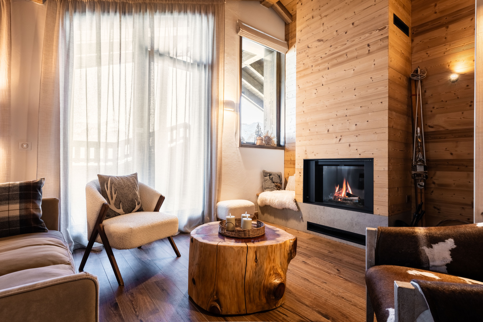 Un séjour très cosy avec coin télévision, enceinte sonos, cheminée, bureau, avec accès à la terrasse couverte de 24m² et au balcon.