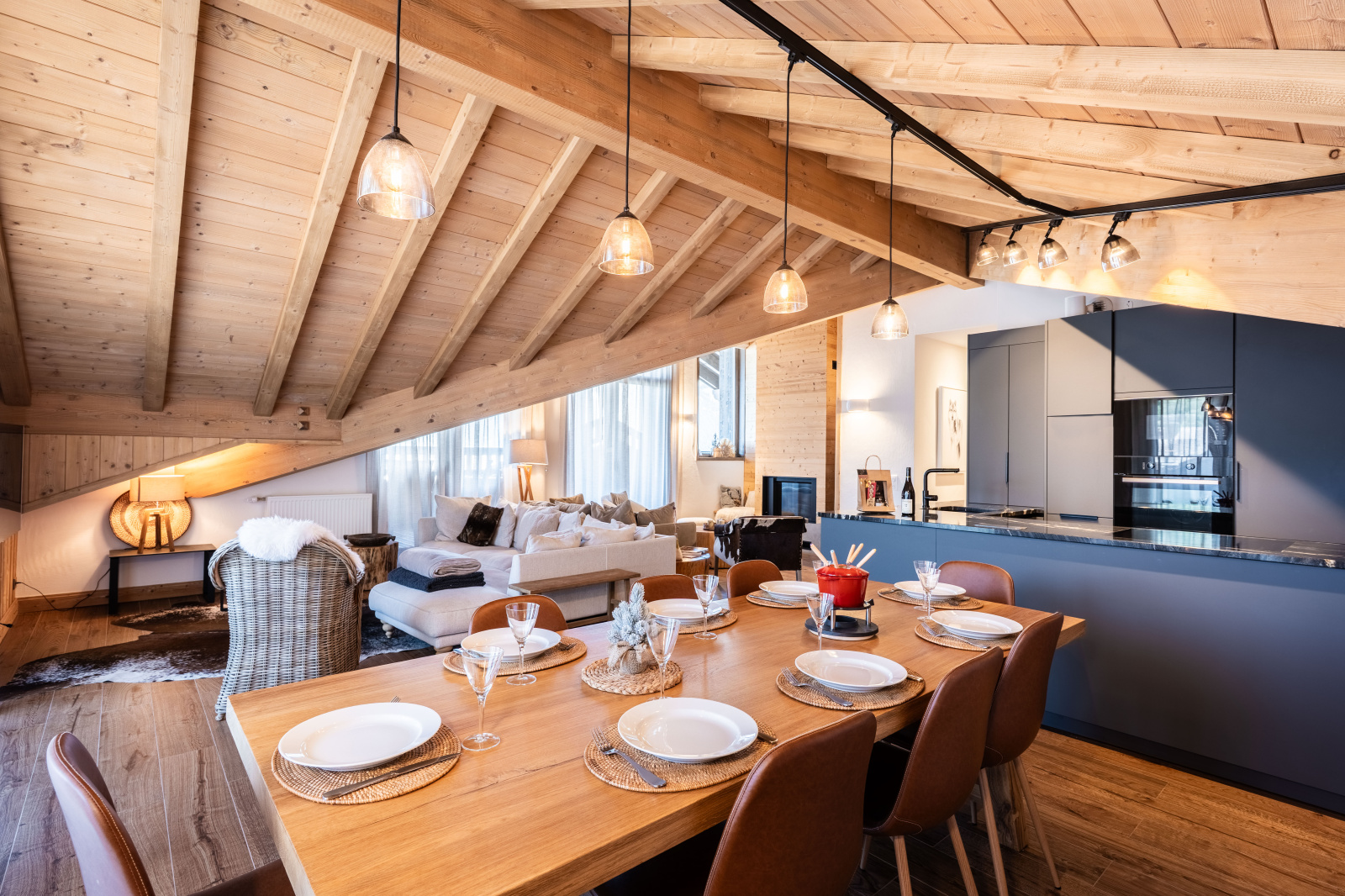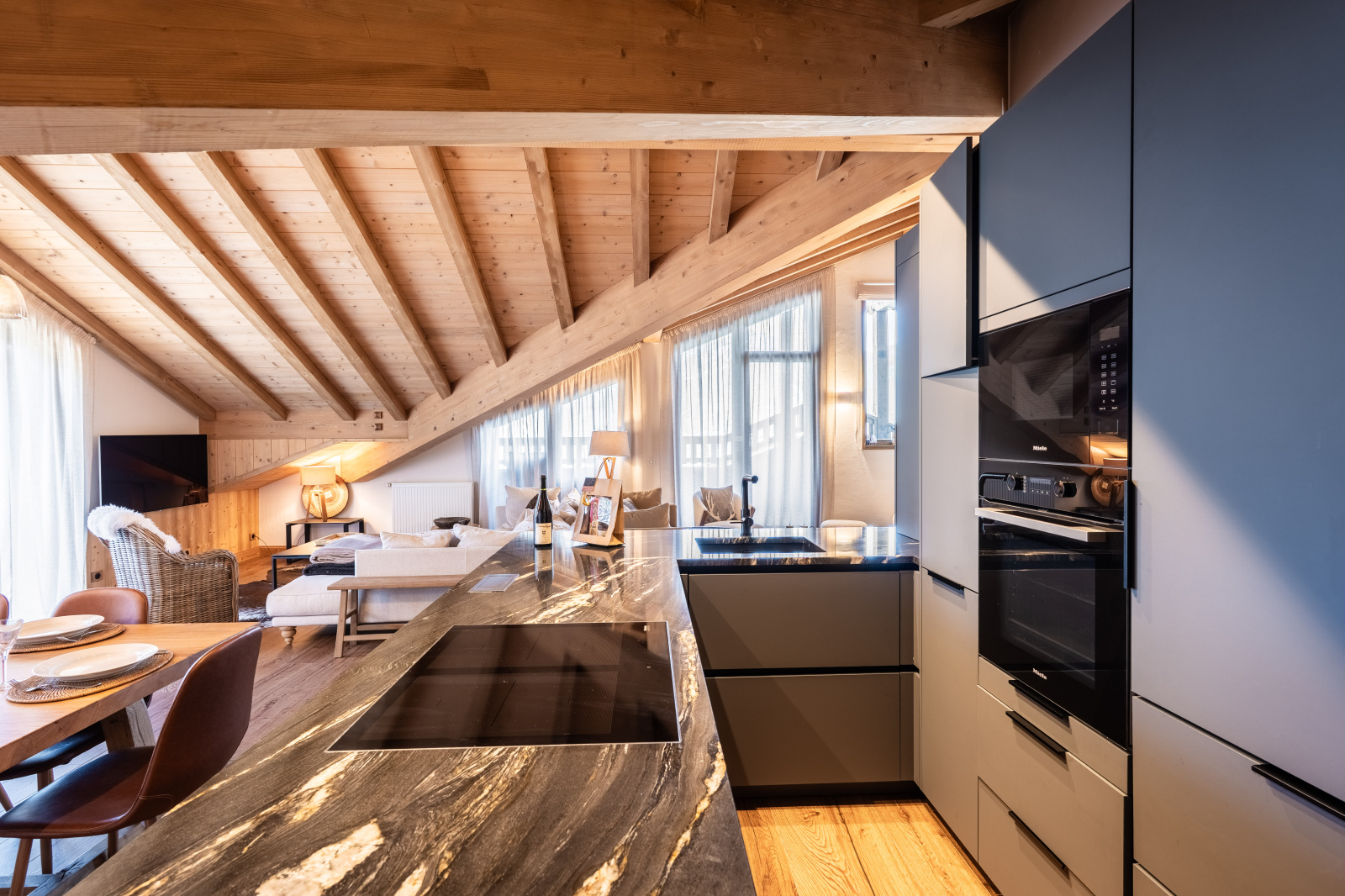 Une cuisine moderne et design avec réfrigérateur / congélateur, lave-vaisselle, 4 plaques de cuisson, four, micro-onde, cafetière Nespresso, grille-pain, bouilloire électrique, appareil à raclette et à fondue, plancha, etc...