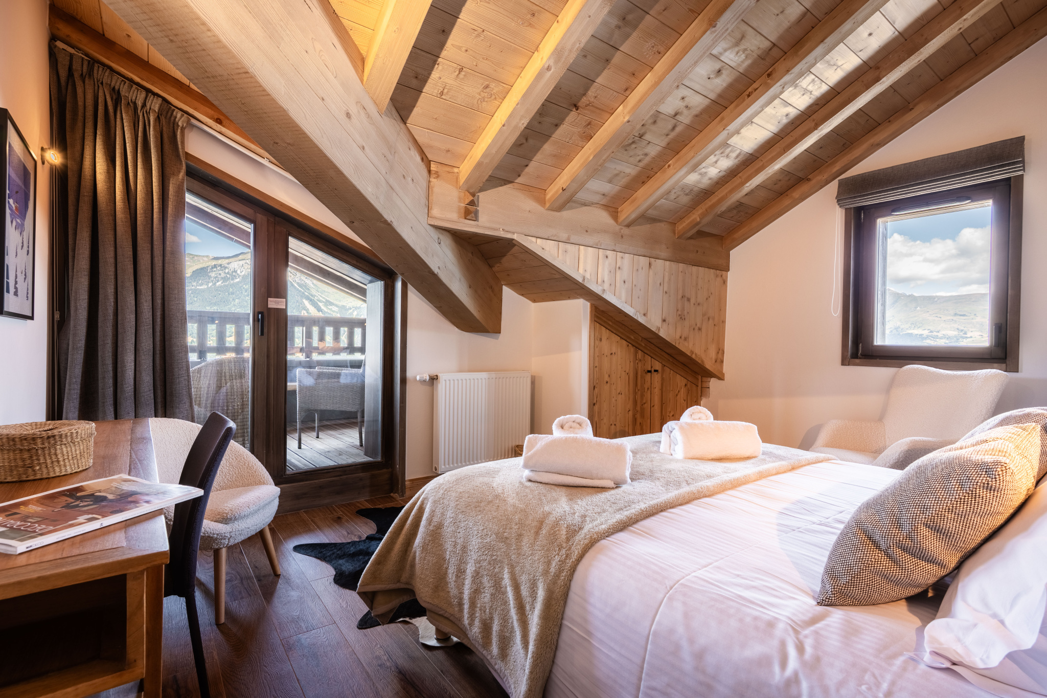 Une Chambre en Suite avec deux lits jumeaux en 90cm, une salle de bain attenante avec douche et baignoire, et accès au balcon.