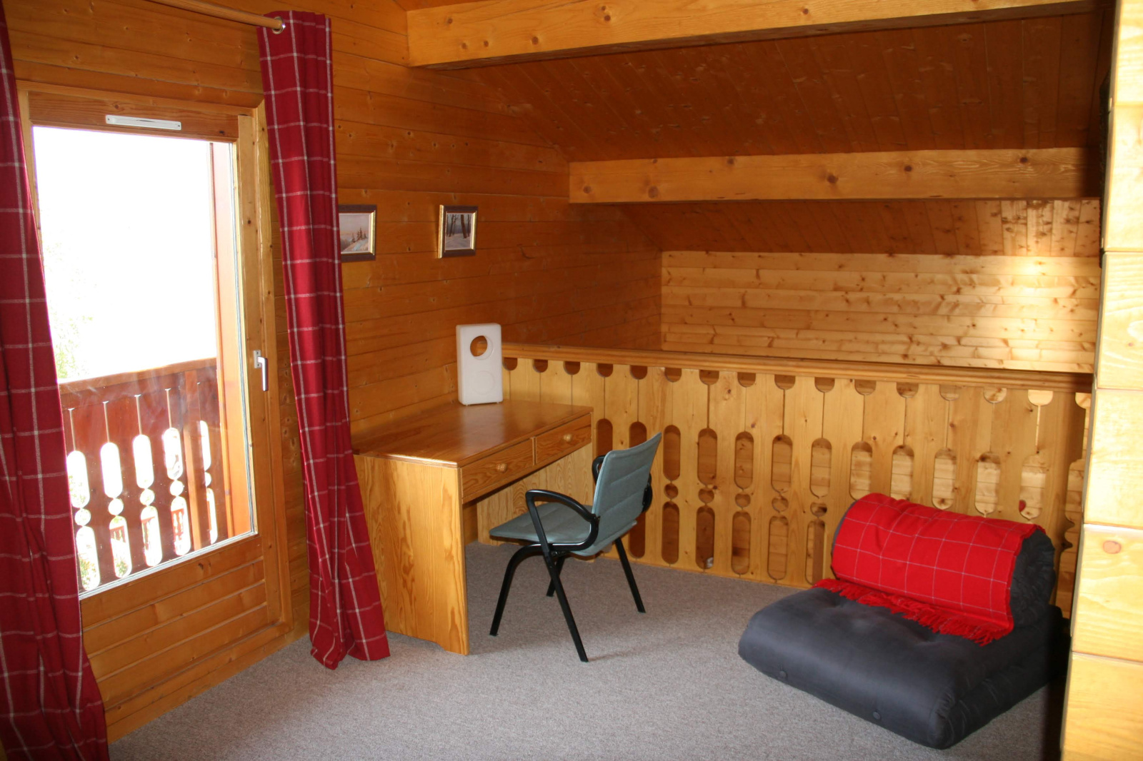 Au 2ème étage, une mezzanine avec un canapé-lit (en 160), et un espace bureau.
