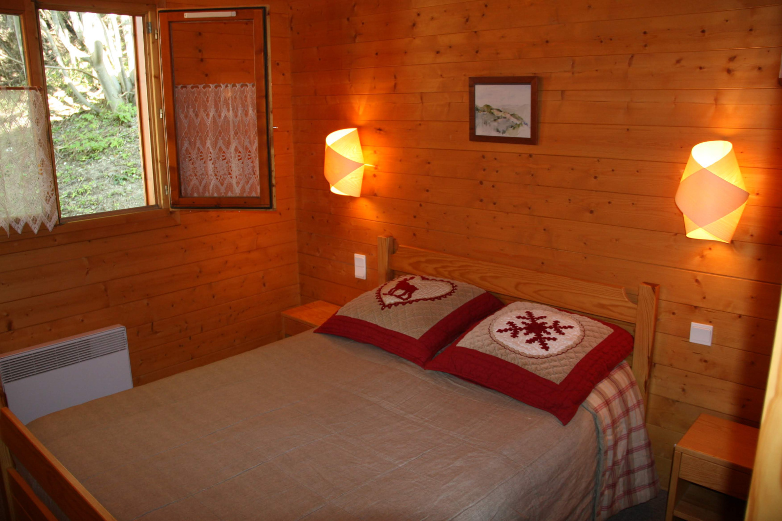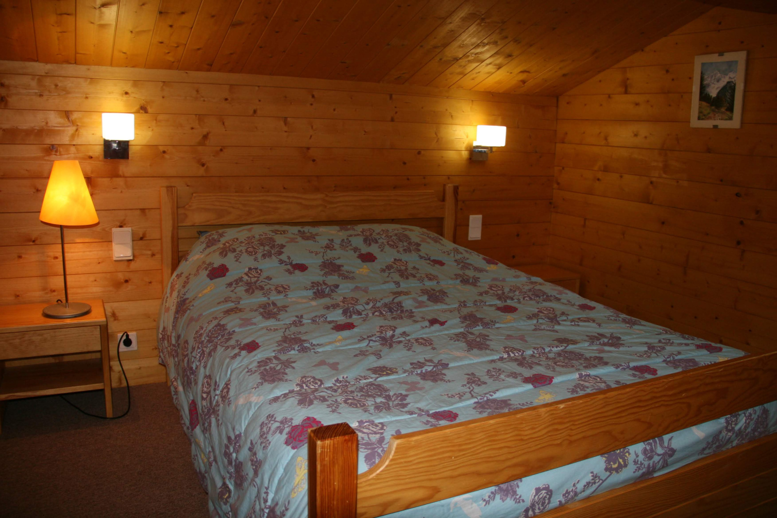 Une chambre avec un lit double (en 140) et placard de rangement.