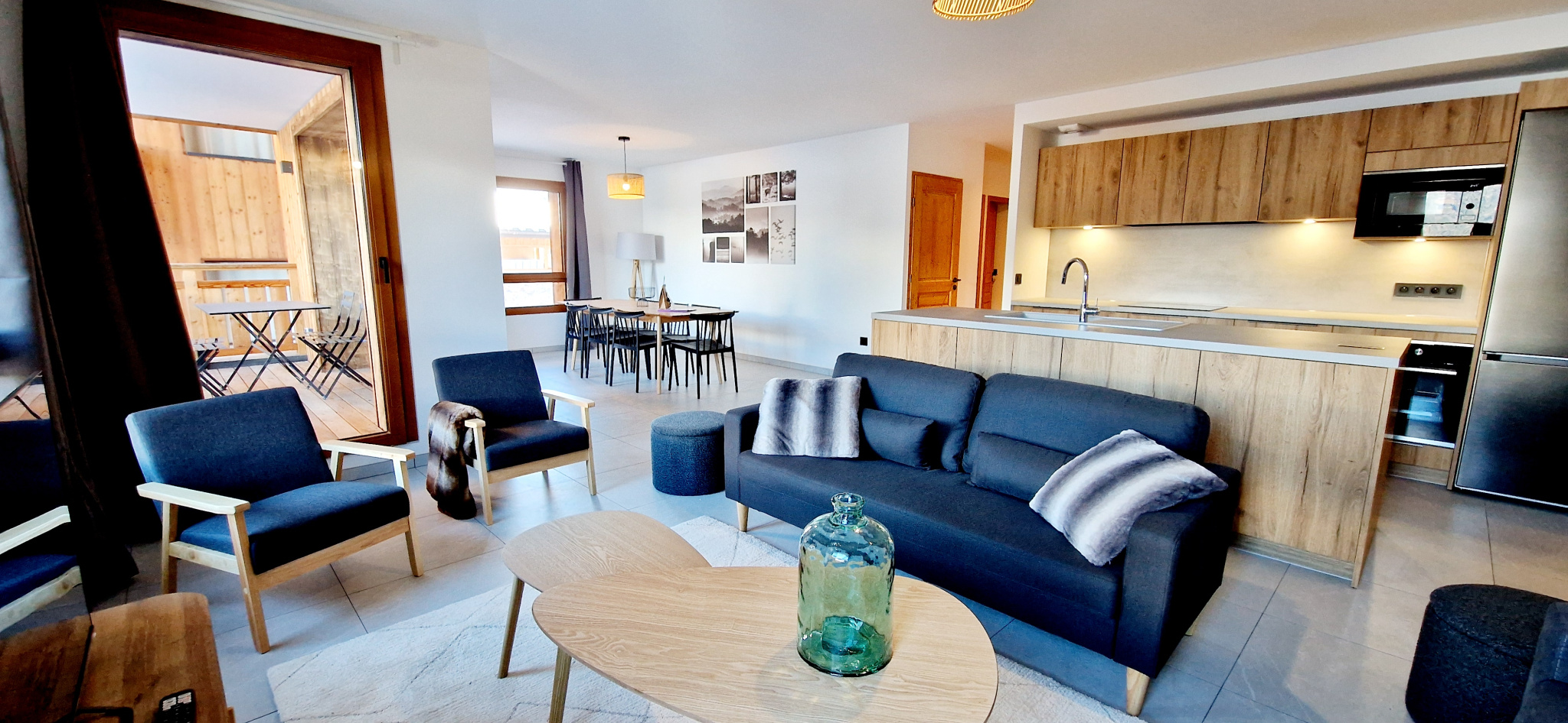 Une cuisine toute équipée avec lave-vaisselle, four, réfrigérateur, four micro-onde, 4 plaques électriques, bouilloire, cafetière électrique, grille-pain, appareil à raclette, robot de cuisine, congélateur.